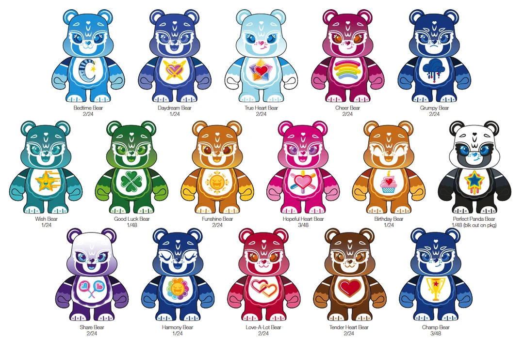 Each collectible 3-inch tall figure is made of high-quality vinyl and is foil bagged and blind boxed to preserve rarity and collectibility. Each time you open one its a new surprise. Collect all 16 Care Bears art figures today to add some artistic Care Bear cheer to your life!