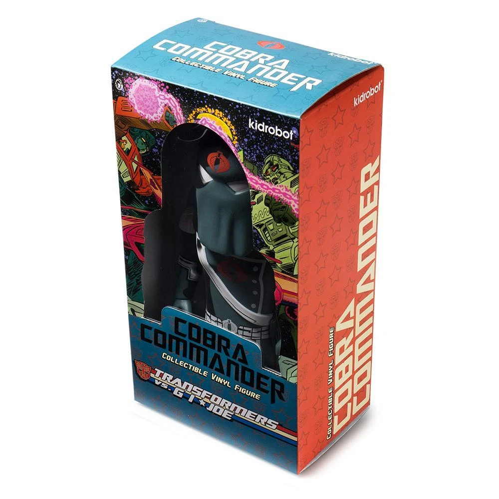 Kidrobot has teamed up with toy giant Hasbro for a an all new collection of Transformers vs. G.I. Joe toys, art figures and collectibles based off the John Barber & Tom Scioli comic book that has gained an international cult-following! Kidrobot is excited to present a piece of the Transformers vs GI Joe puzzle with the Cobra Commander Art Figure. Once Cobra Commander was a man. He left behind his wife and son for unknown reasons to become a terrorist mastermind. The ruthless leader of Cobra, who has risen from the dead to take his rightful place as the leader of the earth-shattering Decepticobra Alliance is also ready to take his rightful place in your vinyl collection. The 7-inch tall Transformers vs G.I. Joe Cobra Commander Art Figure comes in two collectible colors: a blue color way and this Kidrobot.com exclusive black color way (Limited to 200 pieces world-wide). Add both versions to your collection today and get ready for a battle of epic proportions!