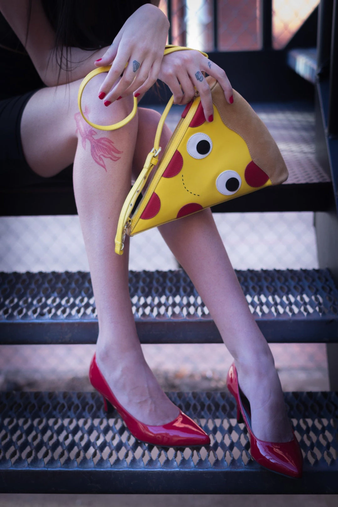Kidrobot brings you this fashionable runway-ready Yummy World Pizza Clutch Purse Bag designed by the team at Kidrobot. This sexy and stylish leather purse bag features Cheezey Pie and includes an adjustable leather strap to throw over your shoulder on your way out of the house. Remove the strap and this bag turns into a fun clutch to accessorize any outfit. Comes with a branded Kidrobot box and red dust bag.