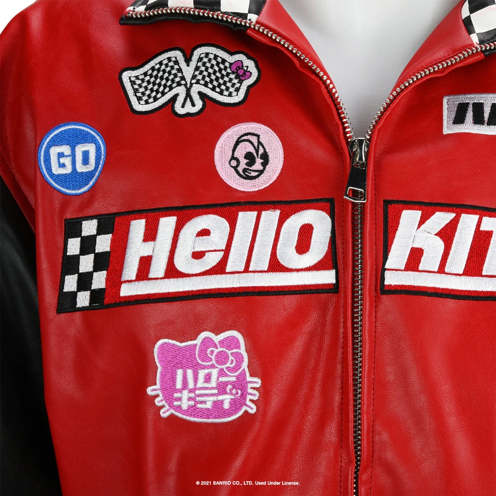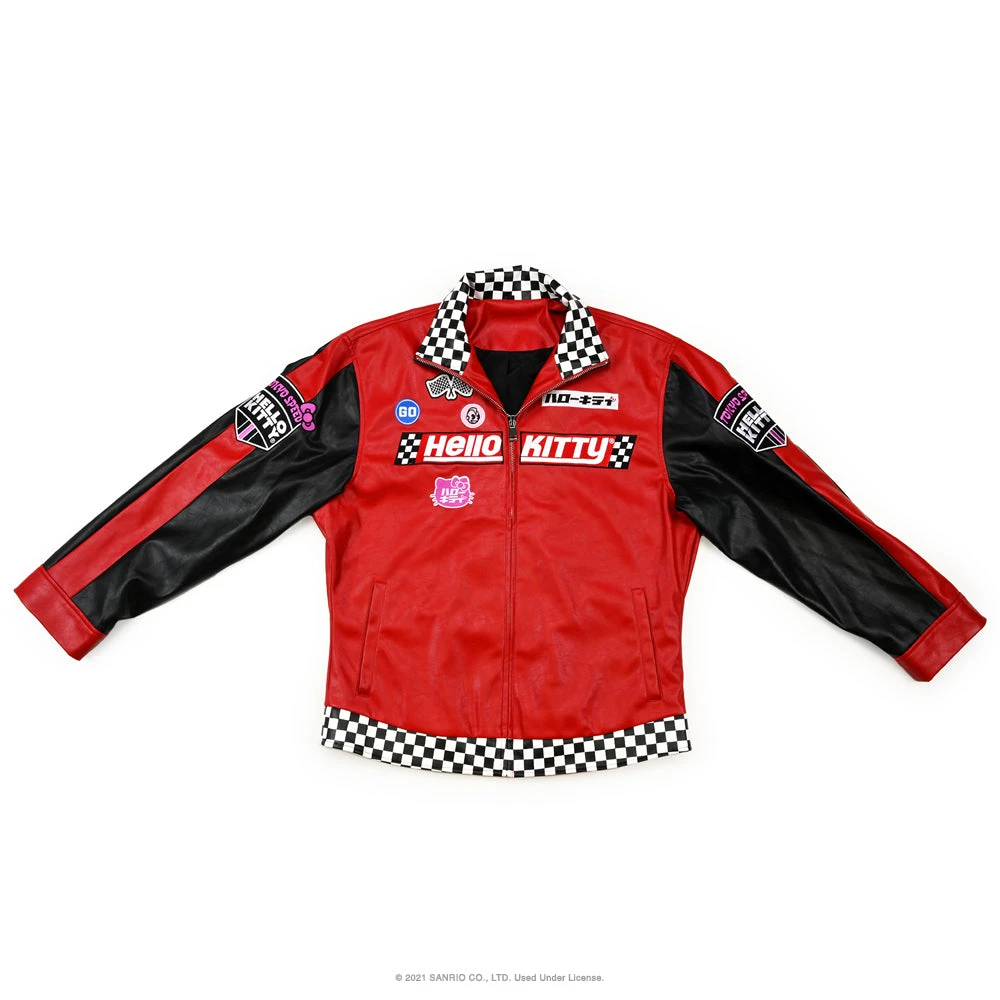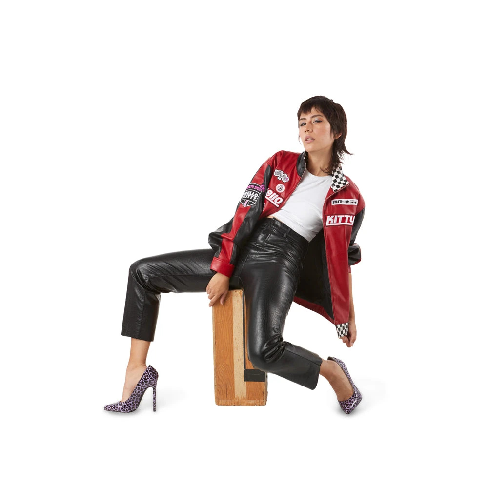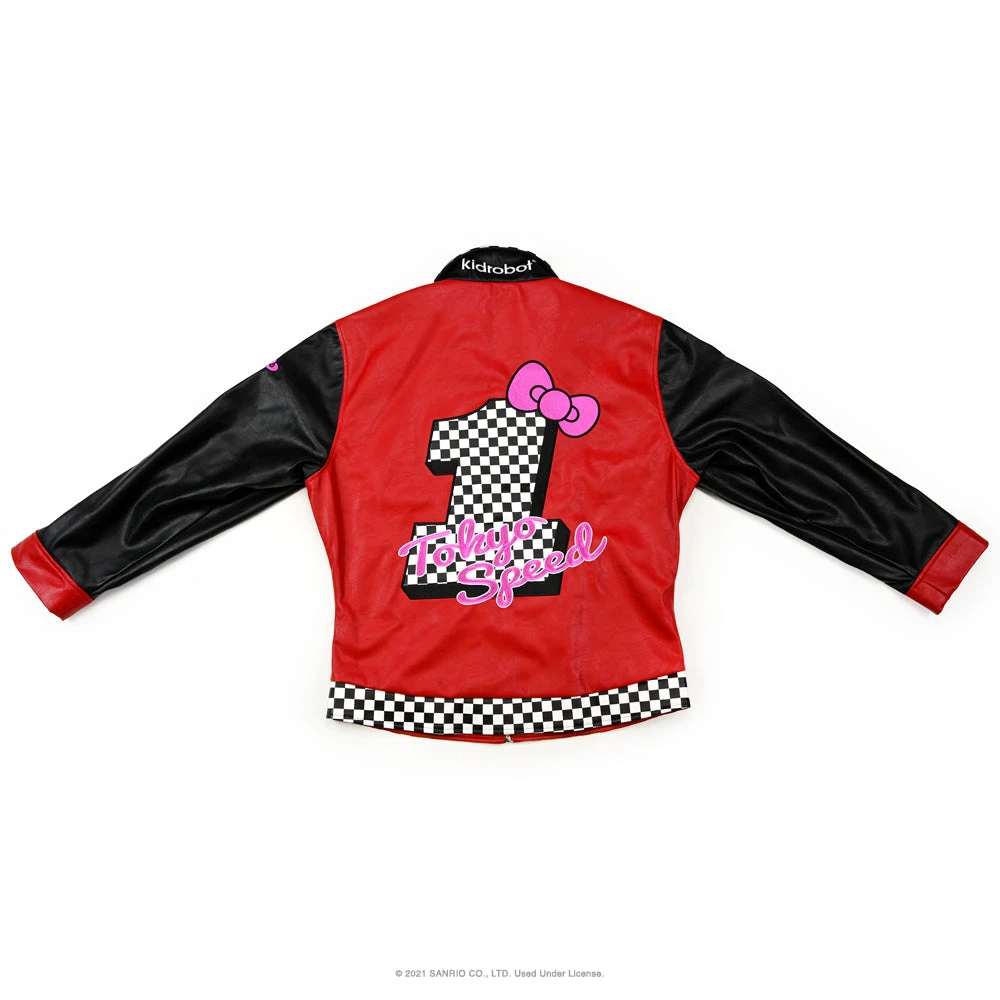 Let’s GO! Race for the finish line in style with Kidrobot’s Hello Kitty® Tokyo Speed Moto Jacket in Racing Red. This premium piece of Hello Kitty® apparel features embroidered patch details, checkerboard racing flag trim, zip front, and extra cute back graphics. Flip-up the collar for a little extra Kidrobot style! With one inner and two outer pockets to stash all your gear. The faux leather jacket is fully lined in woven polyester.